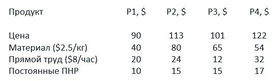 Для производства 4-х продуктов компания использует один и тот же состав рабочей силы, оплачиваемый по единой ставке, часы труда являются ограниченным ресурсом. Бюджетные производственные расходы приведены ниже.